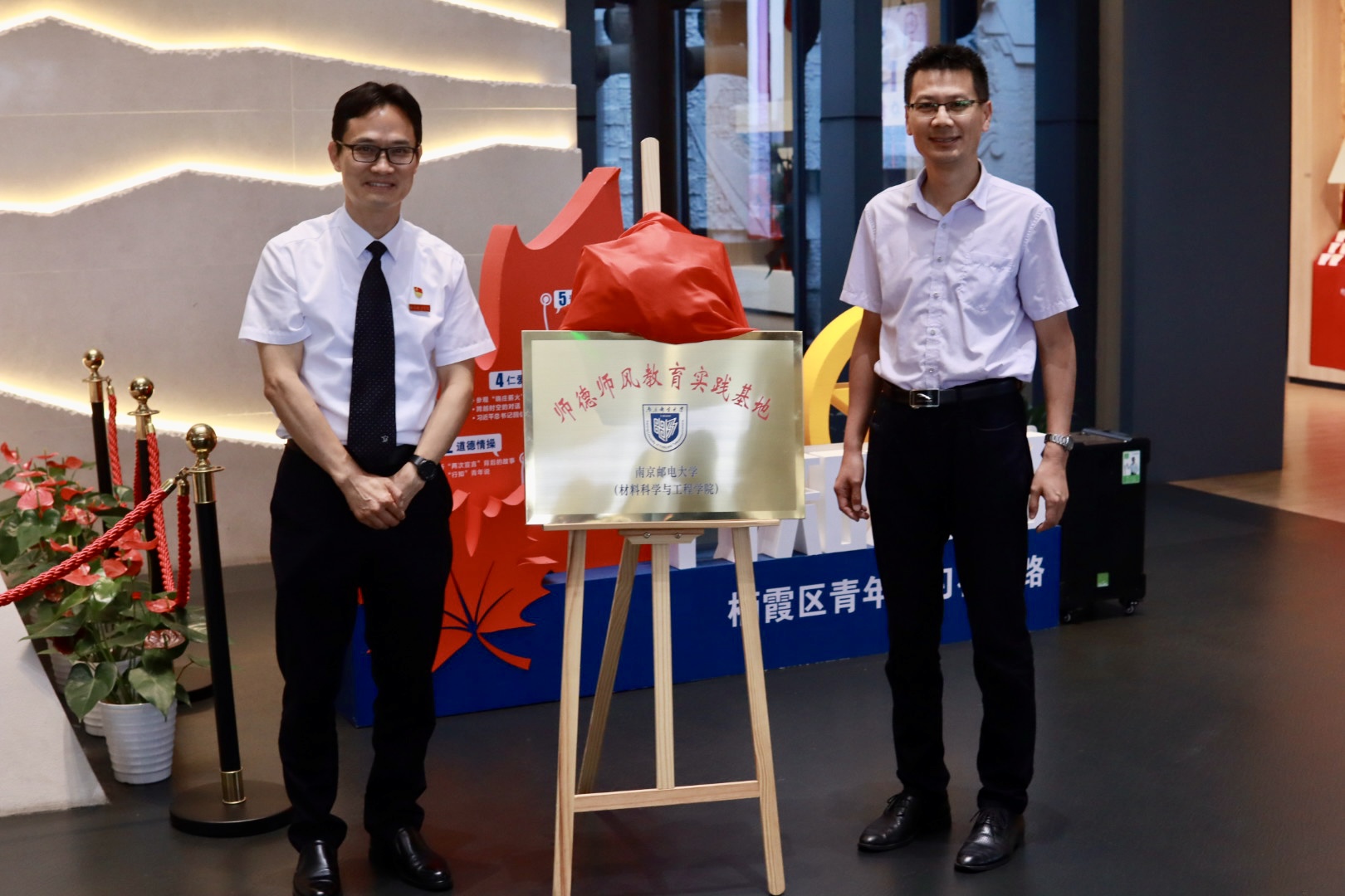 江苏省陶行知纪念馆何文秋馆长和轮盘游戏 赵强副校长为南邮轮盘游戏 “师德师风教育实践基地”揭牌。