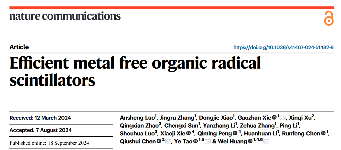 近日,有机电子与信息显示国家重点实验室黄维院士、陶冶教授团队和福州大学陈秋水教授在有机闪烁体领域取得新进展,通过将纯有机发光自由基作为闪烁体,有效避开了暗三线态激子引起的激子利用低的问题,实现了高效的X射线辐射发光性能和纳秒级的辐射发光寿命,相关成果以“Efficient Metal Free Organic Radical Scintillators”为题发表在Nature Communications(《自然·通讯》)上。谢高瞻副教授、陈秋水教授、陶冶教授和黄维院士为论文共同通讯作者,硕士生罗安晟为论文第一作者。东南大学罗守华教授在医用显微CT成像方面给予了大力支持。