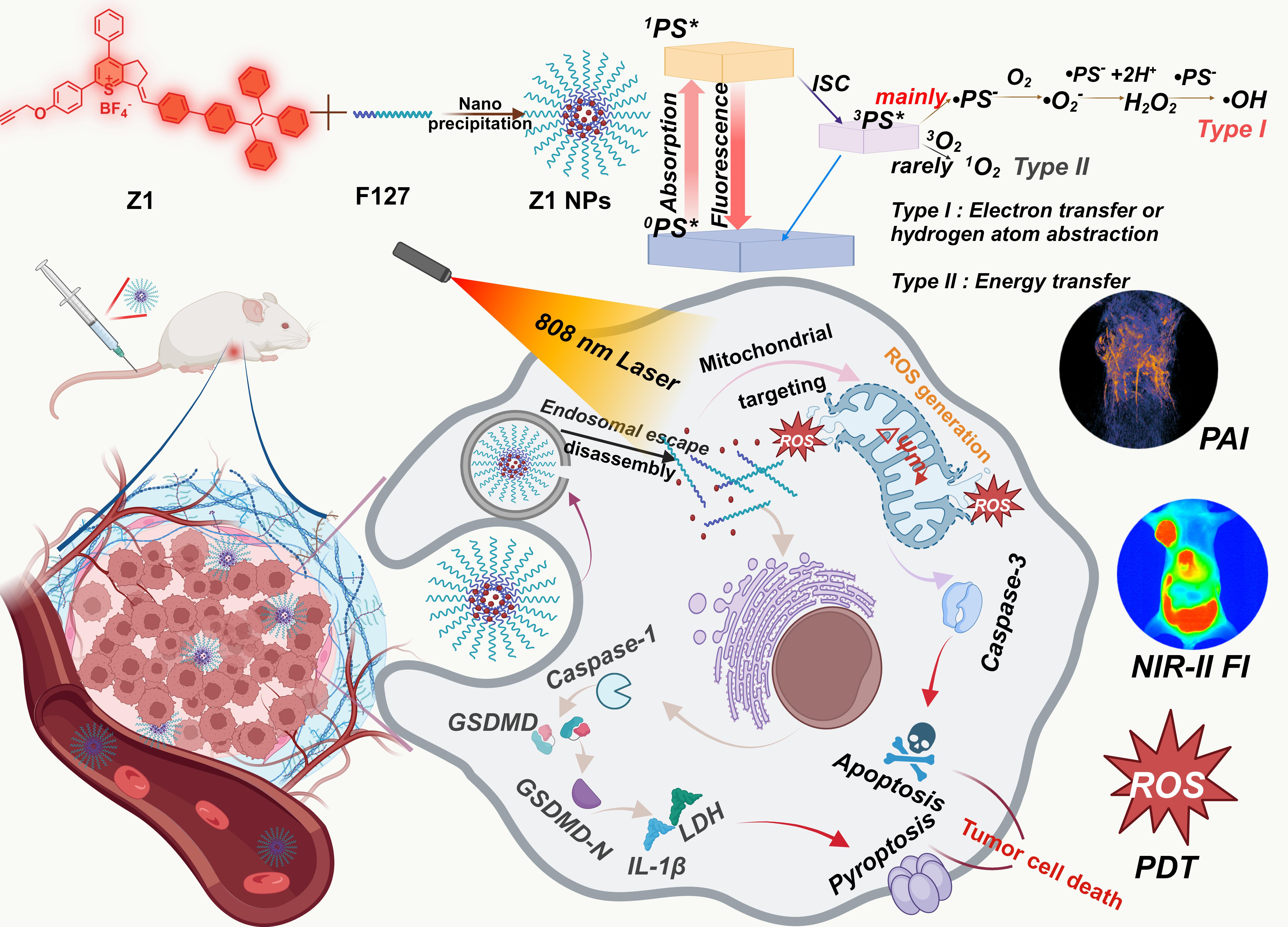 王犇同学在近红外二区小分子探针设计及生物应用领域取得重要研究进展。细胞焦亡又称细胞炎性坏死,是一种程序性细胞死亡,表现为细胞不断胀大直至细胞膜破裂,导致细胞内容物的释放进而激活强烈的炎症反应。细胞焦亡是由gasdermin介导的细胞程序性坏死,在癌症治疗中潜力巨大。光动力治疗(PDT)可以通过光敏剂(PS)产生活性氧(ROS)进而诱导细胞焦亡。然而,许多PS缺乏对特定亚细胞的靶向性,且局限于NIR-I荧光成像,在一定程度上降低了治疗效果。因此,开发具有细胞器靶向功能、高穿透深度的细胞焦亡介导的光疗对于癌症治疗至关重要。针对上述问题,该团队开发了四种具有不同苯环数的硫吡啶结构分子Z1-Z4,初步探索它们的光动力性能。其中,Z1具有更高的苯环占比,表现出优异的ROS生成和线粒体靶向能力以及大的斯托克斯位移。通过两亲性聚合物F127将Z1包覆,制备了Z1 NPs。Z1 NPs在808 nm激光照射下表现出高ROS生成(尤其是I型ROS),可引起线粒体功能障碍,并通过细胞焦亡和细胞凋亡有效抑制肿瘤生长,且副作用最小。此外,该Z1 NPs还能实现活体NIR-II荧光成像和光声成像。相关成果以“A Mitochondria-Targeted Photosensitizer for Combined Pyroptosis and Apoptosis with NIR-II Fluorescence/Photoacoustic Imaging-Guided Phototherapy”为题在化学领域国际顶级学术期刊Angewandte Chemie International Edition(《德国应用化学》)上发表。轮盘游戏 范曲立教授、尹超教授和青年教师周晖为论文共同通讯作者,本科生王犇为论文第一作者,轮盘游戏 为第一署名单位。相关研究得到了国家自然科学基金、江苏省自然科学基金、江苏特聘教授计划、江苏省高等学校自然科学研究面上项目、有机电子与信息显示国家重点实验室主任基金等项目的支持。
