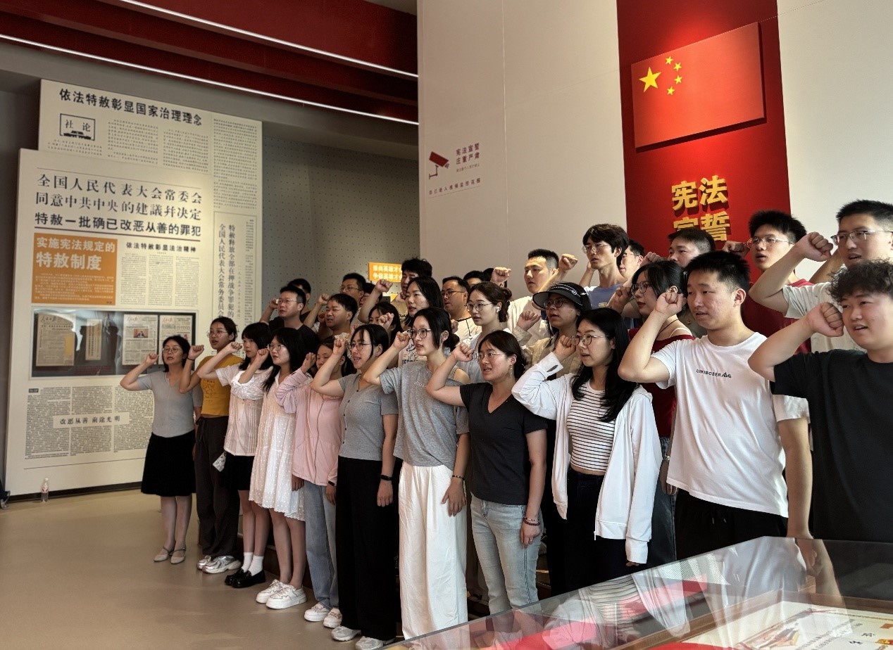 在展馆内,大家开展了法纪和廉政教育,即将奔赴五湖四海的毕业班党员和全体师生党员一同进行庄严肃穆的守法宣誓,在宪法宣誓区,吕蔷蔷副书记带领大家进行宪法宣誓。大家面向国徽与宪法文本,高举右拳,以铿锵有力的声音庄严宣誓:“忠于中华人民共和国宪法,维护宪法权威,履行法定职责……”这神圣的誓言,不仅是对国家根本大法的尊崇,更是对自身作为科研工作者所肩负的法治责任和学术使命的郑重承诺。