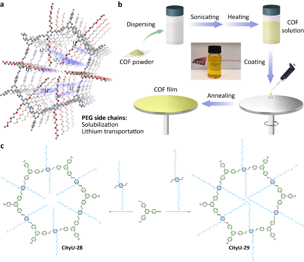为了解决这一问题,研究团队提出了一种可溶性亲锂共价有机框架(COF)的设计策略。通过引入甲基聚乙二醇(mPEG)作为侧链,两种COF(CityU-28和CityU-29)不仅变得可溶而适用于溶液加工技术,而且可以促进电池中锂离子的迁移。此外,当涂覆在LMB的锂阳极上时,两种COF均可作为人工固体电解质界面(ASEI)抑制锂枝晶生长,从而使电池长期稳定。值得注意的是,对称CityU-29@Li电池可以在2 mA cm-2的电流密度和1 mAh cm-2的面比容量下工作5000小时以上。CityU-29@Li||LiFePO4全电池在1 C条件下循环1500次后,容量保持率达到78.9%,库仑效率约为99.9%。这项工作可以提供一种可溶性COF的通用设计策略,并启发它们在各种场景,特别是在能源相关领域中的应用。
