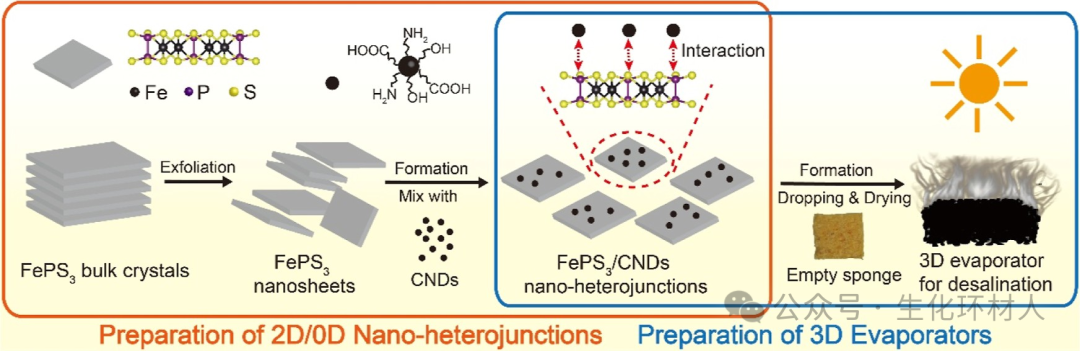 图1 FePS₃/CNDs 2D/0D纳米异质结用于太阳能海水淡化示意图。