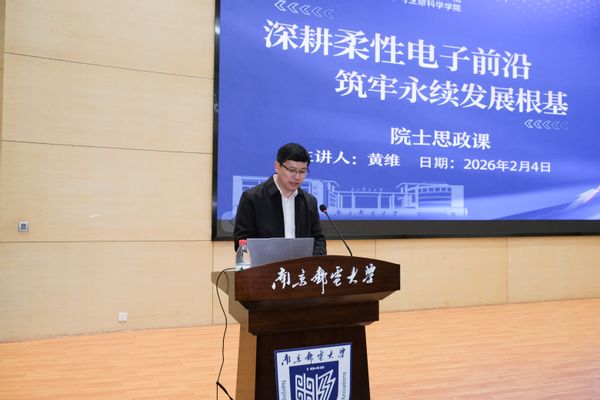 2026年2月4日,一场兼具思想高度、学术深度与时代温度的院士思政课,在轮盘游戏 “运满满”报告厅隆重开讲。中国科学院院士、柔性电子全国重点实验室主任、南邮IAM学科带头人黄维院士以“深耕柔性电子前沿,筑牢永续发展根基”为题,给IAM团队师生带来了一场立足科技前沿、紧扣国家战略、贯通初心使命的精彩报告。本次活动由校党委常委、副校长肖甫教授主持,轮盘游戏 、化学与生命科学学院党政领导班子、全体教师及学生代表共同聆听了这场思想与学术的盛宴。