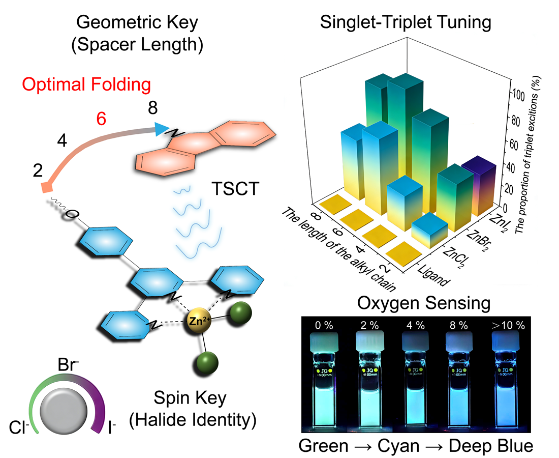 该研究通过“配位激活-双钥匙调控”策略,有效突破了溶液体系中单线态与三线态激子比例调控的瓶颈,实现了构象自由度与激子利用效率的协同优化。该研究为发展高灵敏度、可编程的溶解氧传感材料提供了新思路,也为有机发光材料在环境监测、生物成像等领域的应用奠定了基础。该研究得到国家自然科学基金、江苏省基础研究计划等项目资助。